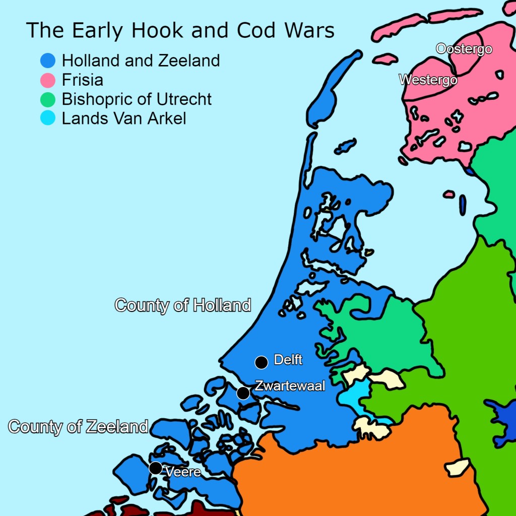Notable Events: Bavarian Inheritance of Hainault-Holland-Zeeland, Formation of the Hook and Cod factions, The Hook and Cod Wars, The Arkel War