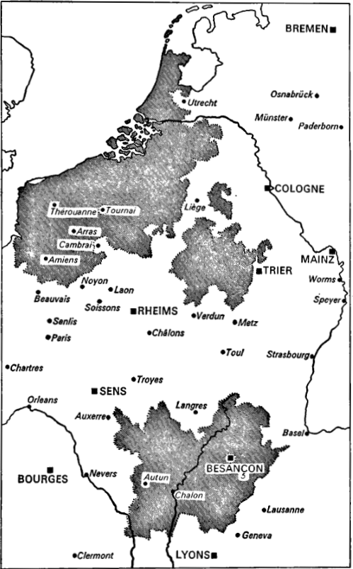 Left: The seats of Bishops and Archbishops in and around Burgundy in the later 1400s from Richard Vaughan’s biography of Philip the Good. Right: A Portrait of a Man by Rogier van der Wetyden. This man is reported to be Guillaume Fillastre, the Bishop of Verdun, Toul, and Tournai, Abbot of Saint-Bertin, and Chancellor of the Order of the Golden Fleece.