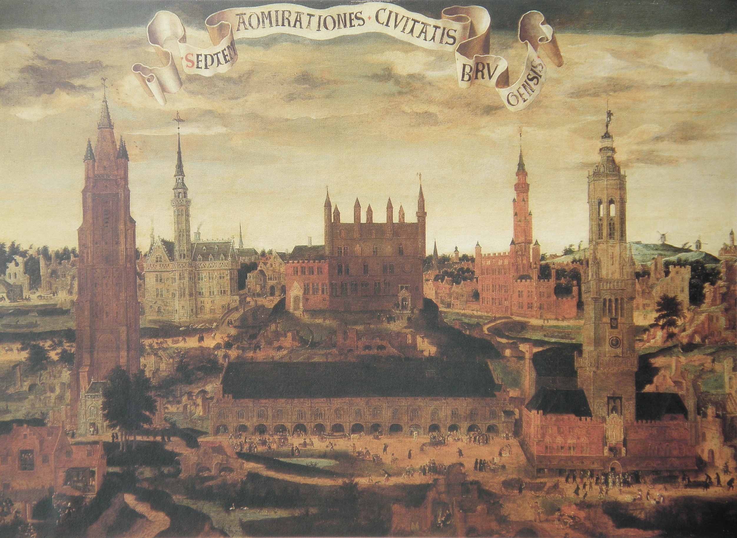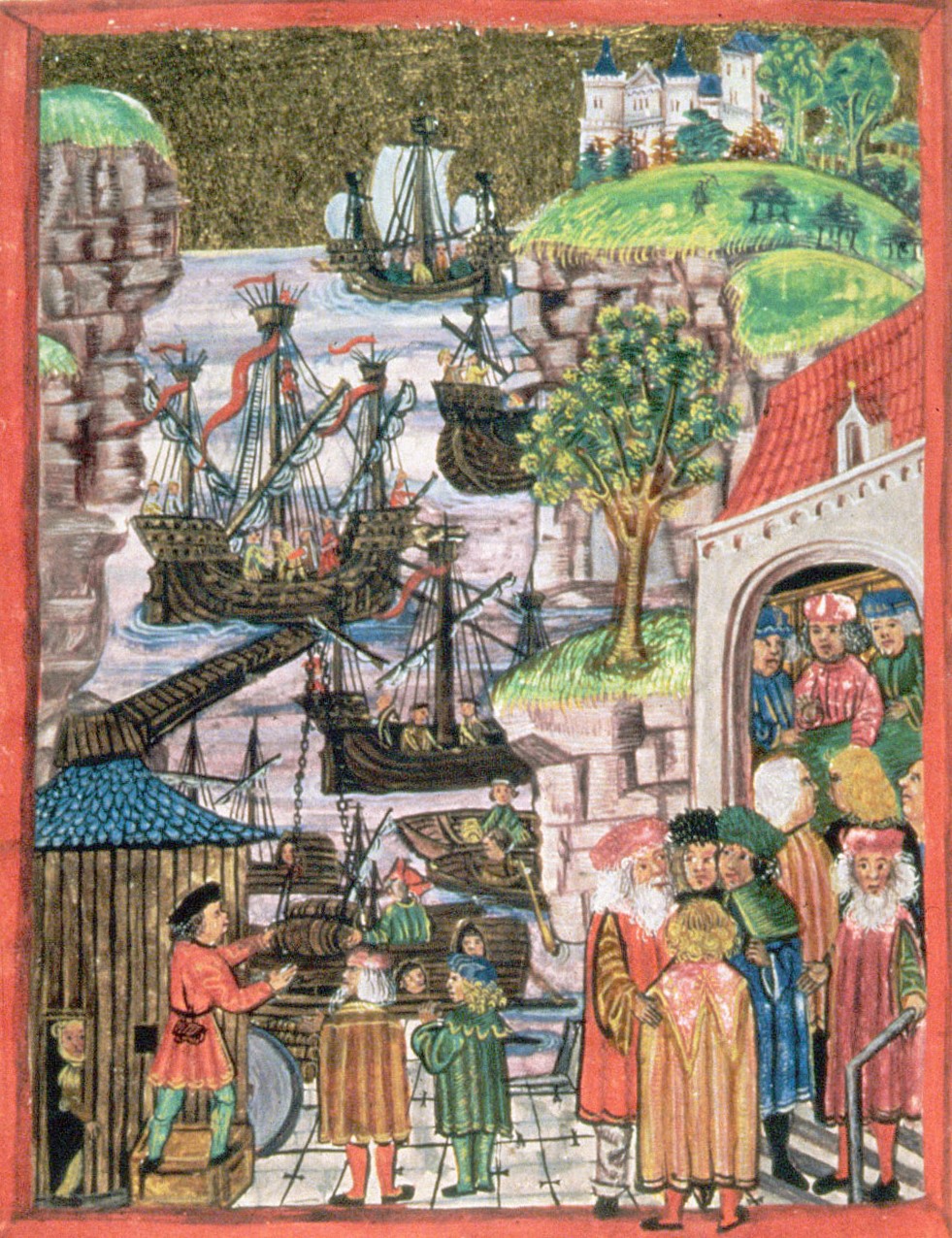 Left: A depiction of representatives from Lubeck and Hamburg sealing their alliance which opened a land route between the cities bypassing the Danish Sound. Right: A depiction of Bruges from the 16th century. The orange building on the right is the Oosterlingenhuis, one of the buildings owned and operated by the Hanseatic Kontor of Bruges.